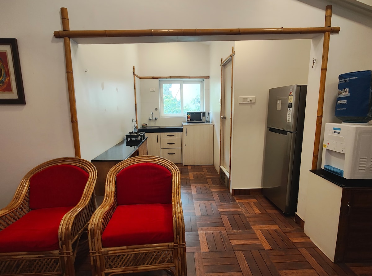 Modern Boho Apartment | Minutes from North Goa's Beaches.A cozy, fully furnished 1BHK retreat on ground floor perfect for couples, friends, or small families. Highlights: - Stylish Boho Interiors with a warm vibe - AC in bedroom & living room for comfort - Smart TV + High-speed WiFi - Equipped kitchen with RO water, cooktop, fridge & washing machine - Shared swimming pool (9 AM–6 PM | swimwear mandatory - On-site gym available at INR 200/-per person per day - 24/7 security - Free Parking