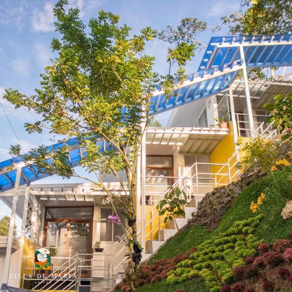 Aquamarine Suite of Villa de Maria Suites is a charming dorm-style retreat ideal for 4–5 guests seeking comfort and serenity. Enjoy a 43" Smart TV, free Wi-Fi, and hot & cold showers with a hair dryer, fresh towels, and toiletries provided. The naturally cool evening breeze adds to the relaxing mountain atmosphere. Guests also enjoy access to Villa de Maria’s peaceful chapel, gazebo, pond, and gardens—perfect for quiet mornings, reflection, or bonding moments surrounded by nature.
