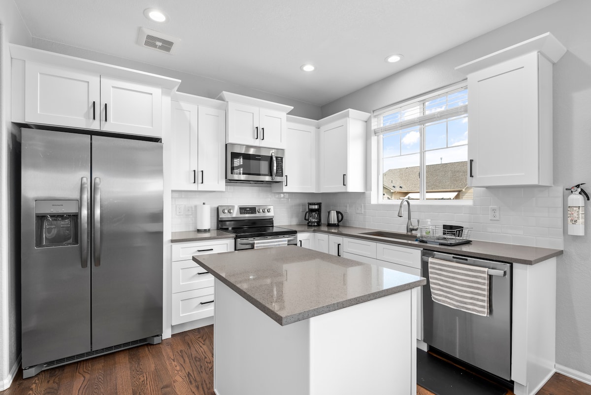 5 dormitorios, con Peloton, espacio de trabajo y entrenamiento, 60 juegos de mesa, hermoso patio cubierto con chimenea ubicado en el centro tecnológico de Denver a poca distancia a pie de restaurantes, bares, Starbucks, una tienda de comestibles y Fiddlers Green para conciertos al aire libre. Hay carriles bici cerca, una biblioteca pública y parques infantiles. Acabo de añadir un juego de Pickleball para la nueva cancha de Pickleball a 1 manzana de distancia. ¡No olvides la estación de tren ligero a 1 milla de distancia para llegar al centro de la ciudad o desde/hacia el aeropuerto! Ofrecemos llegada anticipada GRATUITA cuando esté disponible.