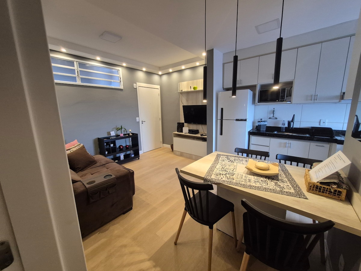Apartamento completo, con capacidad para 2 personas. Cuenta con un dormitorio con cama queen, aire acondicionado, espacio de oficina en casa, armario. Baño privado, cocina completa. TV por cable en la sala y wifi incluido. Condominio con conserjería las 24 horas, piscina, gimnasio y lavandería para uso gratuito. Una plaza de garaje cubierta incluida. Ubicación cerca del centro, supermercado, farmacia y restaurantes. Toallas, ropa de cama, mantas y almohadas estarán disponibles. Barrio tranquilo.