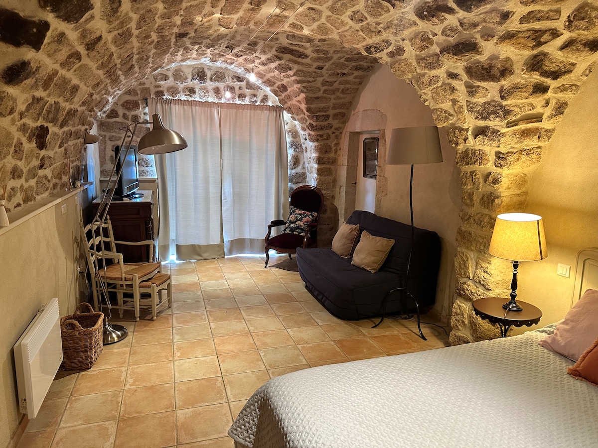 Habitación de piedra abovedada para 4 personas, 1 cama doble y 1 sofá cama. Cuarto de baño privado con ducha. Tiene acceso a la zona de piscina de nuestro hotel: 1 piscina infinita de 16x6 m + 1 piscina infantil + 1 spa de natación de 6x4 m (agua climatizada a 28 y cubierta de octubre a mayo). Pequeña zona de juegos para niños, minicampo de fútbol, pista de petanca, mesa de ping pong, futbolín... En el lugar también está nuestro restaurante y bar.
