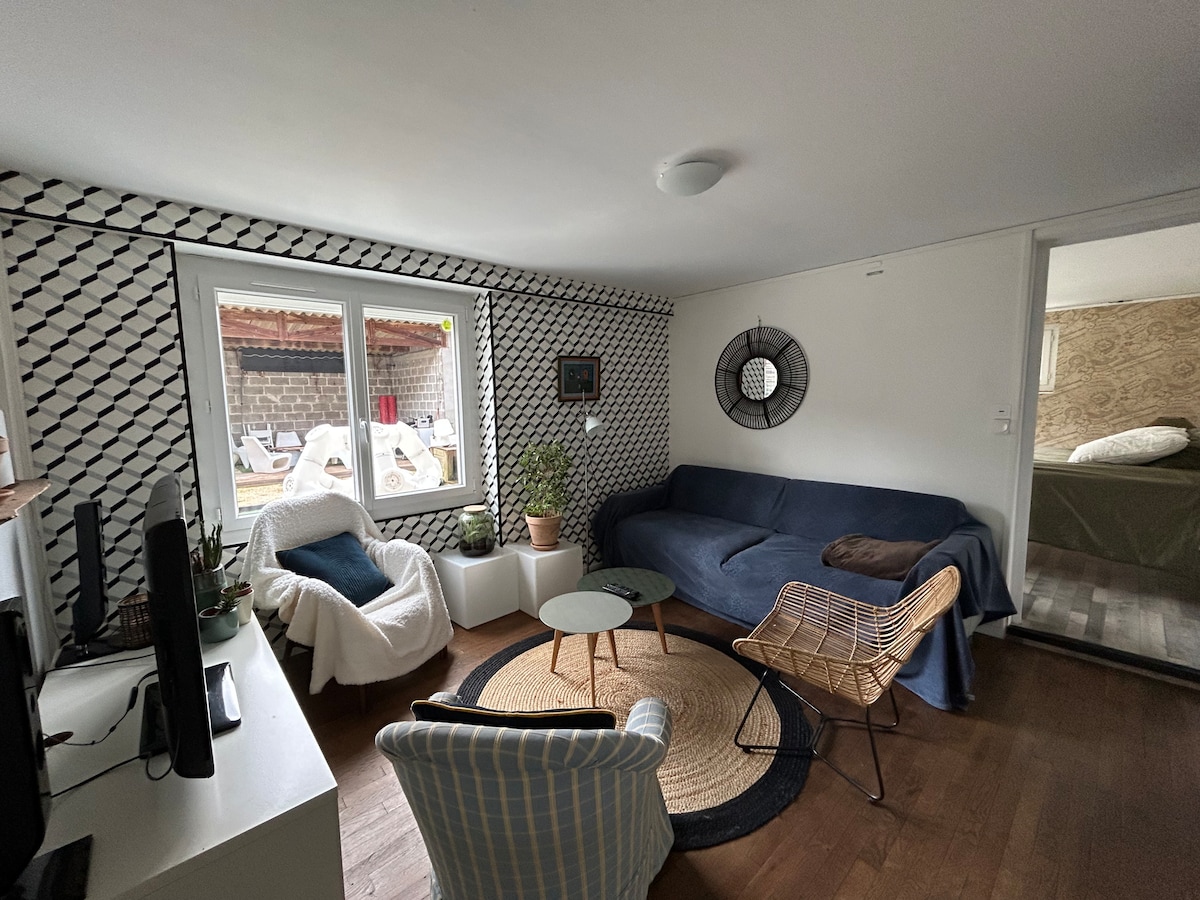 Apartamento acogedor y muy luminoso en la 2ª planta de una casa burguesa totalmente equipada. Tiene una entrada privada en la parte trasera de la casa, en el lado del jardín. Instalaciones: - Para dormir: 1 cama king size - Se proporcionan toallas de baño. - Equipamiento doméstico: cocina con vitrocerámica, microondas, nevera, cafetera, vajilla y cubiertos. - Equipamiento multimedia: TV de pantalla plana, acceso a Internet WiFi - Plaza exterior gratuita.