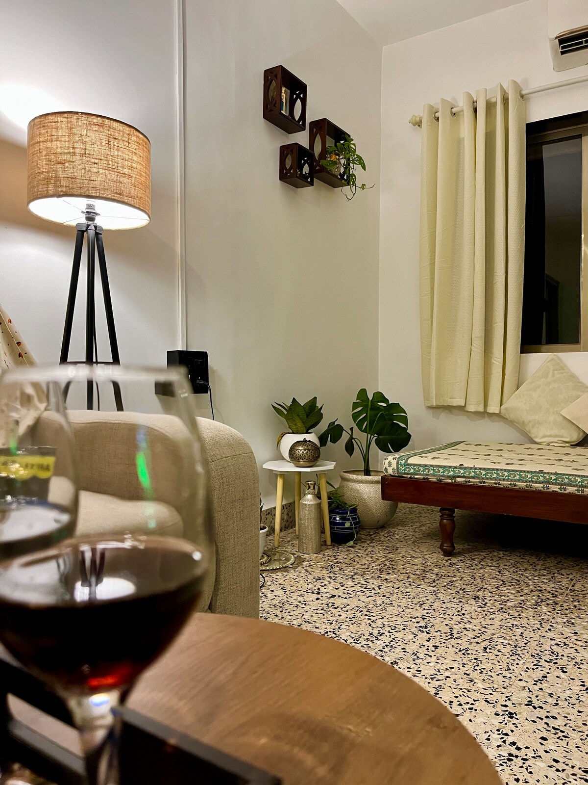 El apartamento con terraza se encuentra en un mercado urbano, a pocos pasos de la famosa playa de Juhu. El apartamento es abierto y espacioso, con una larga terraza llena de plantas. Es un oasis tranquilo en medio de una ciudad bulliciosa. La casa puede alojar cómodamente a dos personas en un dormitorio privado y a una persona adicional en el espacio del estudio (si la hamaca cuenta). Te despertarás con vistas a árboles verdes y cielos abiertos. La casa, aunque está en un edificio antiguo, cuenta con todas las comodidades modernas que uno necesita.
