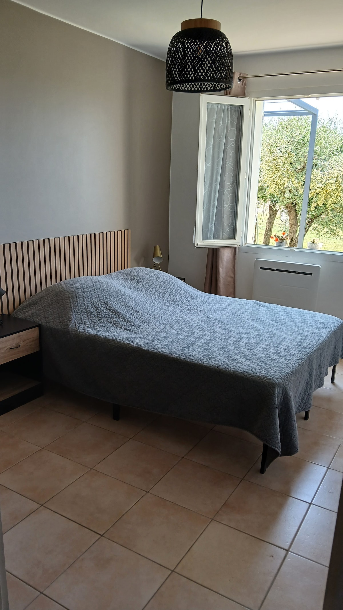La suite Tournesol es ideal para una pareja; 40 m2 que incluyen cocina, dormitorio/sala de estar y vestíbulo con armario, baño con ducha, aseo separado, radio y TV. Amplia terraza de 30 m2 con vistas panorámicas a las montañas de Luberon. La suite está totalmente equipada con todo lo que necesitas, incluyendo café/té, albornoces y maravillosas toallas gruesas. Se ha instalado un eficiente ventilador eléctrico en el techo. ¡Encontrarás sillas adicionales en el pasillo si quieres sentarte junto a la fuente!