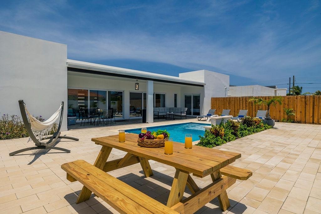 ¡Te doy la bienvenida a tu escapada tropical! A solo 3 minutos de la famosa Palm Beach. Esta villa moderna y elegante ofrece la combinación perfecta de comodidad y lujo. Disfrutá de 3 habitaciones con un diseño precioso y 3 baños completos, ideales para familias o grupos de hasta 6 huéspedes. Relajate en tu piscina privada, tomate sol en una de las muchas zonas de estar y descansá en un entorno tranquilo que se siente como tu propio pedacito de paraíso. ✔ 3 dormitorios ✔ A 3 minutos de Palm Beach Piscina ✔ privada. ✔ Cocinas completas ✔ Apartamento