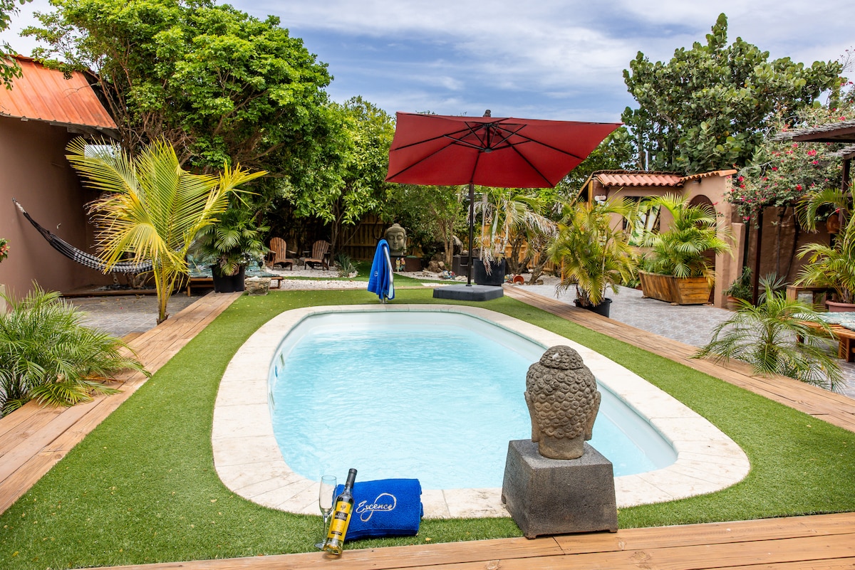 Este alojamiento único tiene personalidad propia. Las parejas pueden darse un lujo con una estancia en este cómodo alquiler vacacional, que incluye una pequeña piscina privada y un patio al aire libre. Sun Experience está a solo 5 minutos en coche de las famosas playas Eagle Beach y Palm Beach, así como de los mejores restaurantes, casinos y vida nocturna de la isla. El apartamento está equipado con una cómoda cama tamaño king y una pequeña cocina completa que te permite preparar comidas en casa. También ofrecemos sillas de playa, toallas y una nevera para los días de playa.