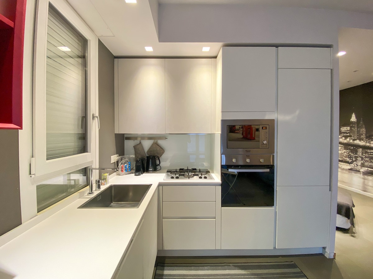 Departamento moderno y luminoso en Assago, en Via Giacomo Matteotti, ideal para estancias de negocios o placer. Las habitaciones están amuebladas en un estilo contemporáneo, con colores neutros y detalles de diseño urbano. La sala de estar es un espacio abierto con una cocina totalmente abierta, una península con taburetes y una sala de estar con un sofá y TV. Amplia habitación doble con armarios y baño moderno con ducha de vidrio.