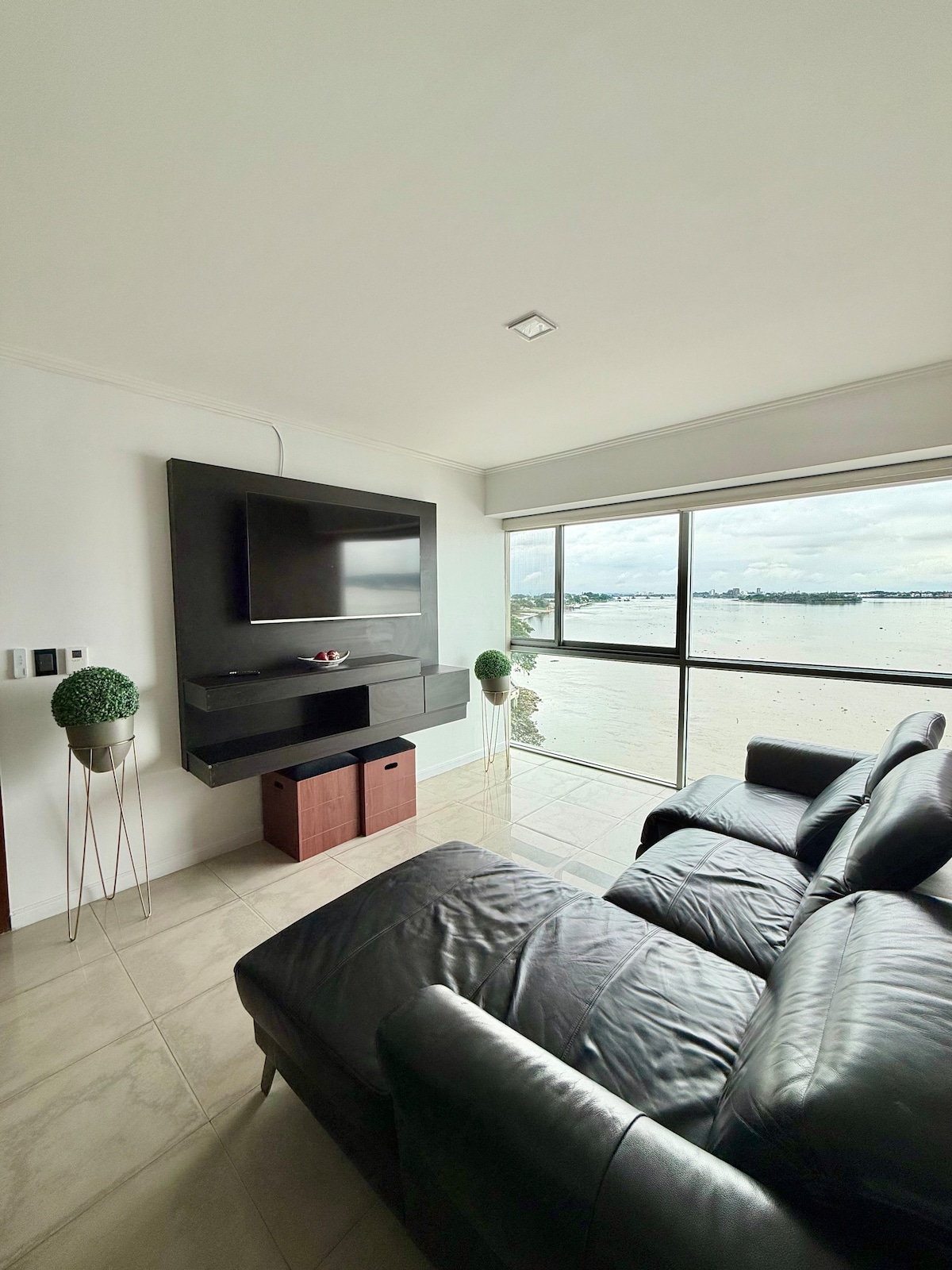 Disfruta de una moderna suite en Puerto Santa Ana, Guayaquil, con espectacular vista al Río Guayas. Cuenta con una acogedora habitación con cama de tres plazas y TV de 55 pulgadas. La sala incluye un mesón estilo americano. Además, dispone de un baño completo con agua caliente. Perfecto para una estancia inolvidable.