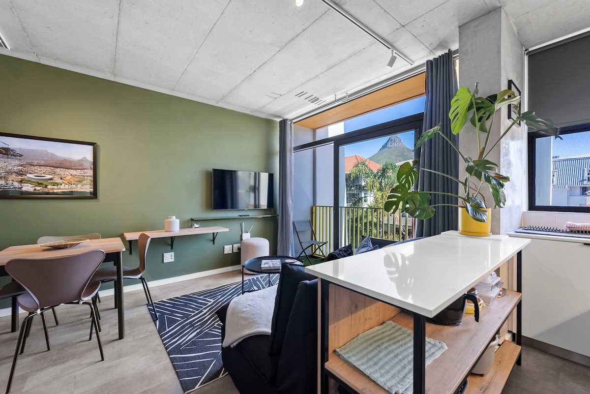 Bienvenido a nuestra nueva casa de diseño donde lo práctico se une a la belleza y el gusto elegante está a la orden del día. Abre las cortinas por la mañana para disfrutar de las vistas a la montaña de la Mesa desde tu amplio balcón. El ambiente industrial y los techos altos dan una sensación de galería. Si el momento te atrapa, dirígete a la terraza de la piscina en la azotea y al área de entretenimiento, donde podrás disfrutar de puestas de sol de color rosa carmesí y vistas de 360 grados de Ciudad del Cabo, incluido el océano Atlántico. *Cero cortes de energía en este edificio.