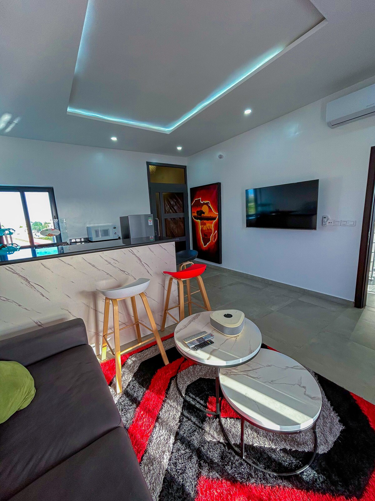 Ofrecemos este hermoso apartamento en la ciudad de Abomey-Calavi, no muy lejos de la capital económica Cotonú. Está cerca del mayor centro comercial Super U. y a pocos minutos de la Venecia de África (Ganvié). Es un apartamento moderno con aire acondicionado (amplio salón y 2 dormitorios independientes) funcional con una cocina totalmente equipada (cocina – horno de gas, etc.). La piscina completamente privada en la azotea es perfecta para su relajación y será exclusiva para usted.