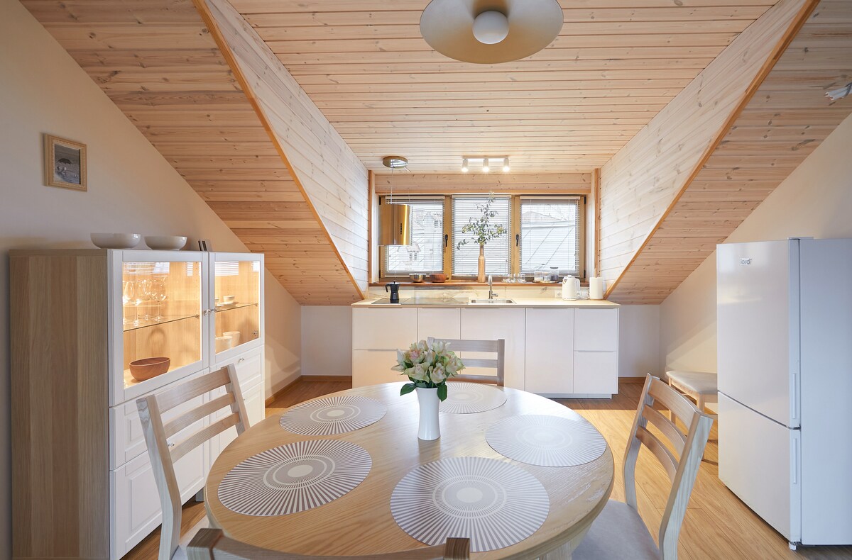 Unique two-level loft with a cozy terrace and peaceful surroundings. Perfect for a relaxing stay, city break or recovery near Kaunas clinics. Enjoy a bright living area with large windows overlooking a peaceful garden, a cozy lounge terrace with string lights, and a beautifully designed bedroom under wooden beams. Conveniently located near the city center and major clinics, this loft offers easy access to shops, cafes, and public transport.