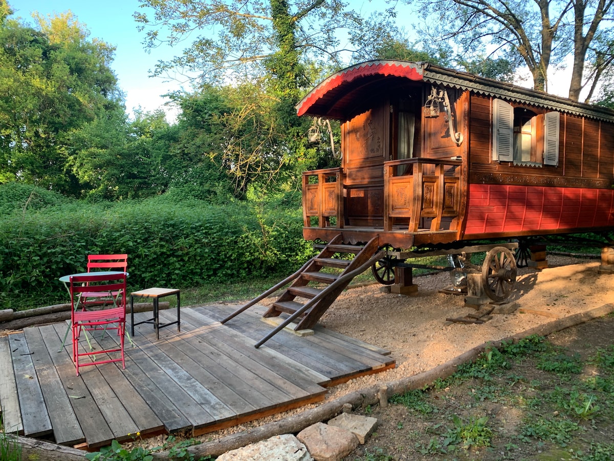 Roulotte cocooning vue Saône 5 mn A6, 40 mn Lyon