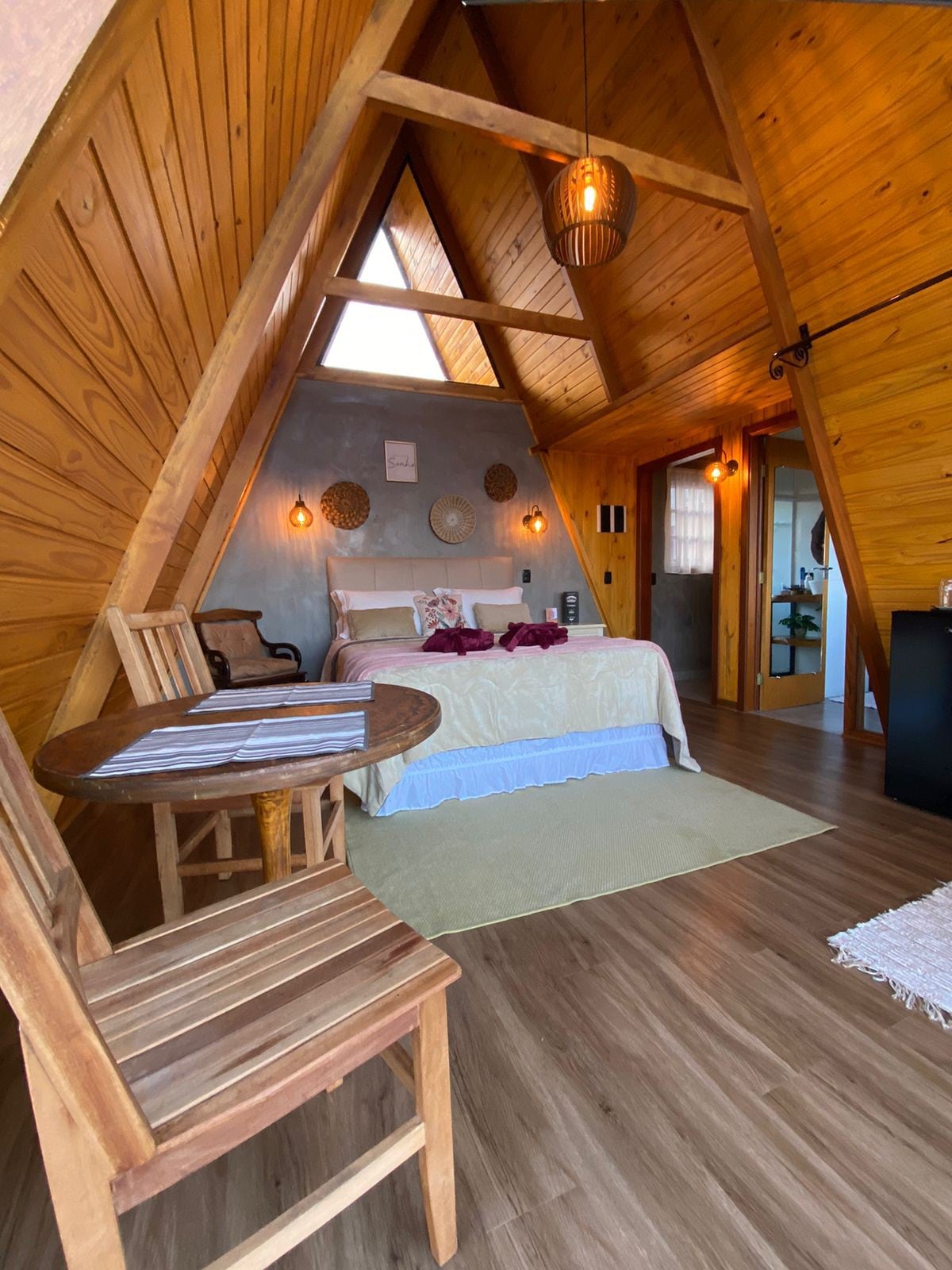 Magnífico chalet A-frame (@ducantochales), ubicado a 7 km del centro de la ciudad. Cerca de dos excelentes restaurantes en el barrio de Venâncios. El chalet Palermo fue diseñado con la intención de proporcionar no solo un alojamiento, sino una experiencia. Tiene un dormitorio en la parte superior, cama tamaño queen y sábanas de alta calidad. En la parte inferior, una cocina completa, sala de estar con sofá cama, chimenea, TV. Baño con dos duchas, bañera de hidromasaje con techo y paredes de cristal, con vistas.
