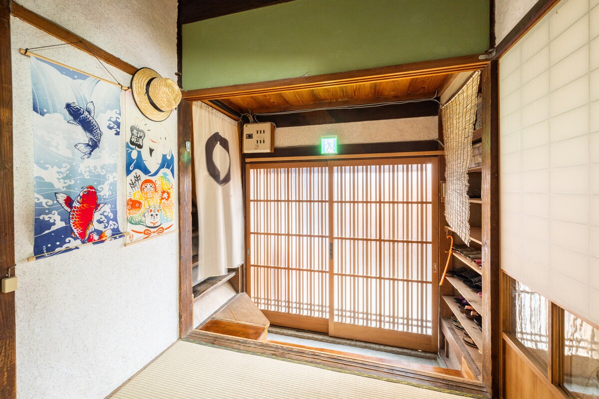 Está a 9 minutos en tren del aeropuerto de Kansai y a 5 minutos a pie.Alquilamos toda la mansión tradicional japonesa del comerciante (casa antigua).Aburi es un nombre que se ha transmitido de generación en generación en nuestra familia. No es solo una casa de huéspedes, sino un lugar donde puedes disfrutar de un viaje japonés con familiares y amigos, sin preocuparte por otros grupos. Esta posada es muy popular entre quienes están interesados en la cultura tradicional japonesa y los fanáticos del anime, como Demon Slayer y Naruto.Es una casa antigua, pero todo ha sido renovado para que los huéspedes puedan tener una estancia cómoda. Se puede utilizar ampliamente para familias y grupos de una a 10 personas.(El precio no cambiará para un máximo de 3 personas) [La mejor hospitalidad no se encuentra en otras casas de huéspedes] El amplio salón interior de 12 tatamis y el jardín japonés que se extiende entre la galería son la esencia de la arquitectura tradicional japonesa.Relajate en la amplia habitación con tatami mientras mirás el jardín japonés. El living, que es un antiguo almacén de arroz, te va a transportar 200 años al pasado. [Para estadías largas] Se proporcionan escritorio, sillas y pizarras.También se puede usar como espacio de trabajo.También tenemos planes de descuento para los huéspedes que se queden 28 días o más.