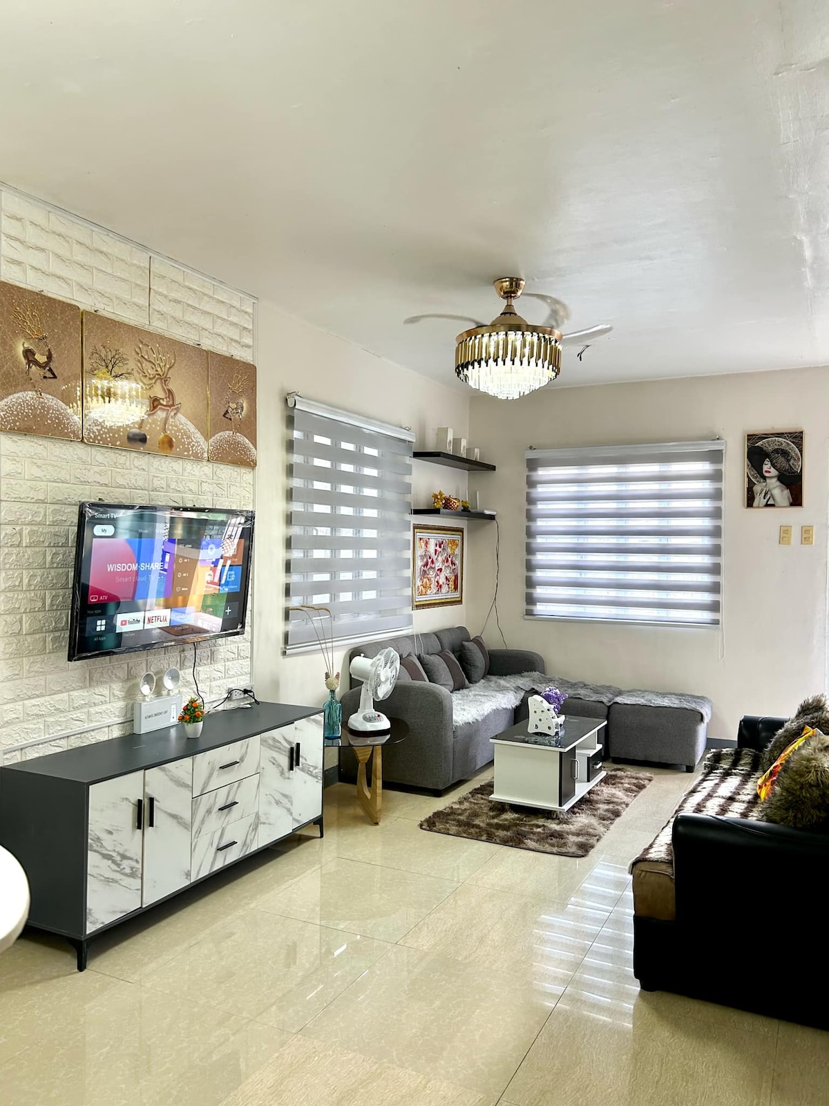 AMENITIES: *exclusive use of the entire House *free wifi access *grilling area *family pool *many parking space *water dispenser *Refrigerator w/ "Knock Twice,See Inside" Technology *microwave *oven toaster *kitchen utensils (plates, spoons, glass and other cook wares) *daily changed Bed sheets and pillows *card games/board games *Videoke *4Bedrooms (1 masters BR with own cr, 2 queen sized BR, 1 room with double queen size BR) *3Bathrooms *Garden Terrace *76 inches TV