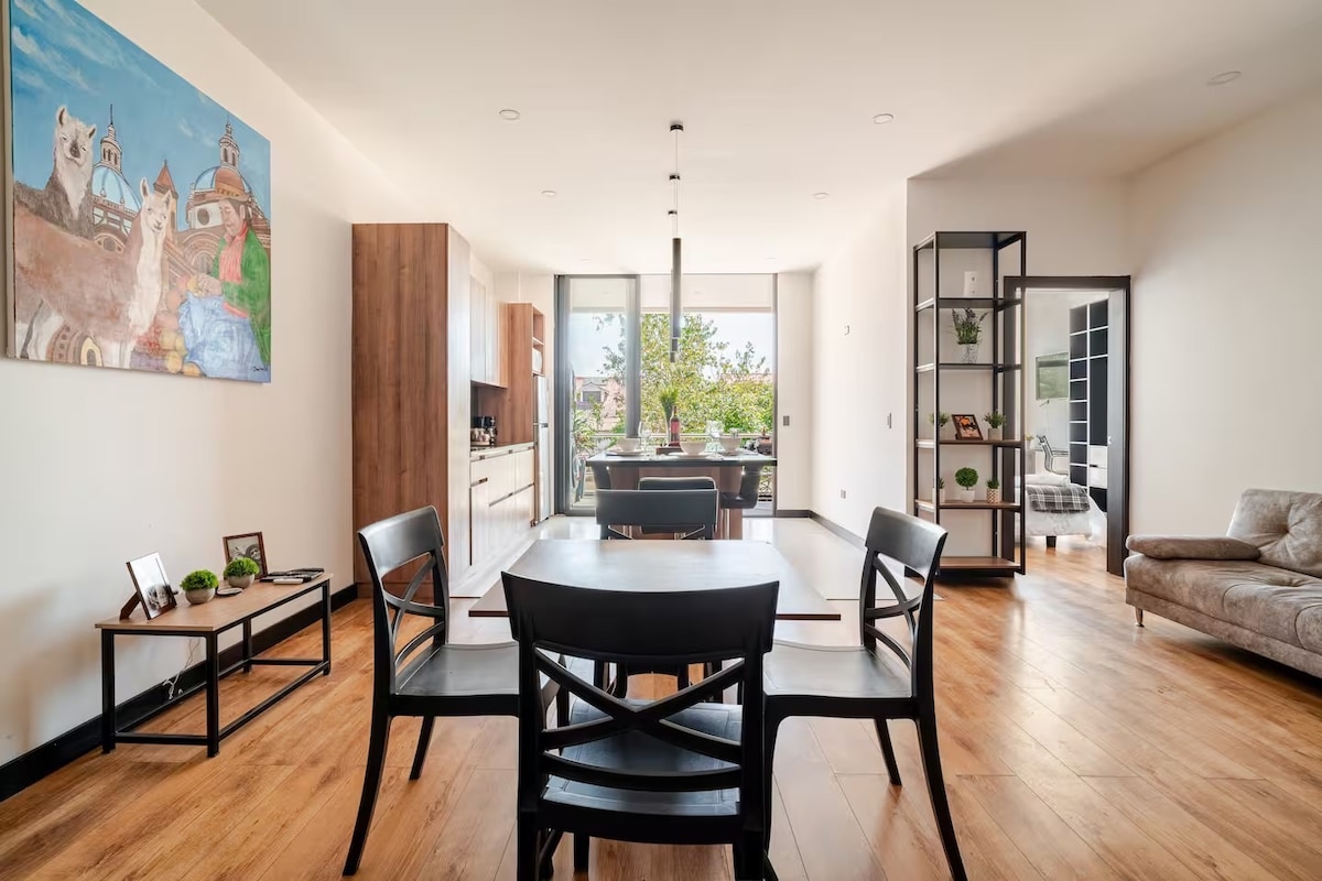 Construido en septiembre de 2022 con energía de respaldo de 2,4 kW. - Calefacción por suelo radiante. - Ventanas con amortiguación de sonido. - Centro de la ciudad: restaurantes, tiendas y bares. - Espacio de trabajo dedicado ideal para trabajar. - Patio con parrilla de gas y asientos. - Ideal para niños con parque infantil portátil, cochecito, asiento elevador y juguetes. - Cocina totalmente equipada, lavavajillas, triturador de basura, microondas, estufa de inducción, licuadora, ollas/sartenes, utensilios, etc. - Entrada segura al edificio. - Entrada al apartamento sin llave. - Cama queen abatible. - Televisor inteligente de 50 pulgadas con IPTV. - Baño con tocador doble. - Apartamento en planta baja.