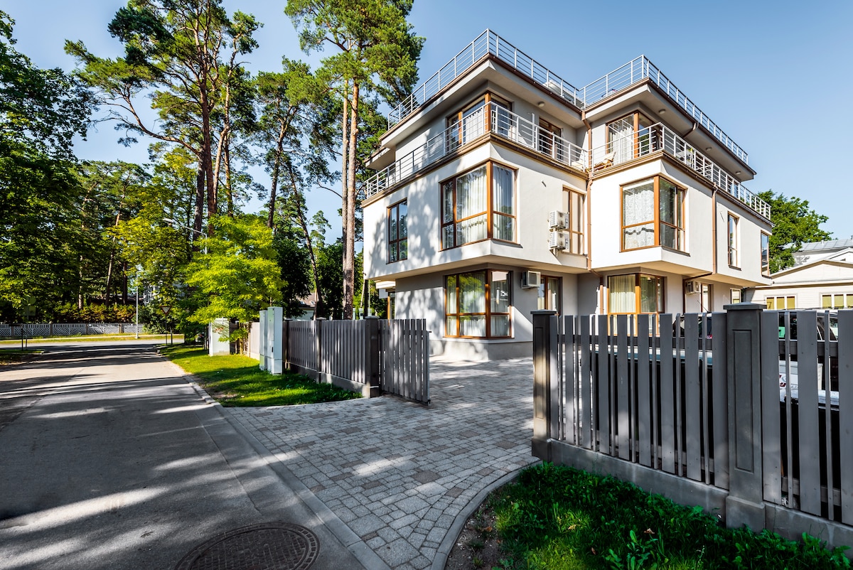 Situado a 5 minutos a pie de la playa. El apartamento ofrece alojamiento independiente con conexión wifi gratuita. La residencia se encuentra en el corazón de Jurmala, en el paseo principal (Jomas iela), que está lleno de restaurantes y tiendas. La sala de conciertos de Dzintari está a solo 3 minutos a pie. El apartamento es completamente nuevo, moderno y cómodo. Cuenta con un diseño individual y una terraza privada. Aeropuerto de Riga a 15 km, casco antiguo a 20 km, Livu Aqua Park a solo 7 minutos en coche.