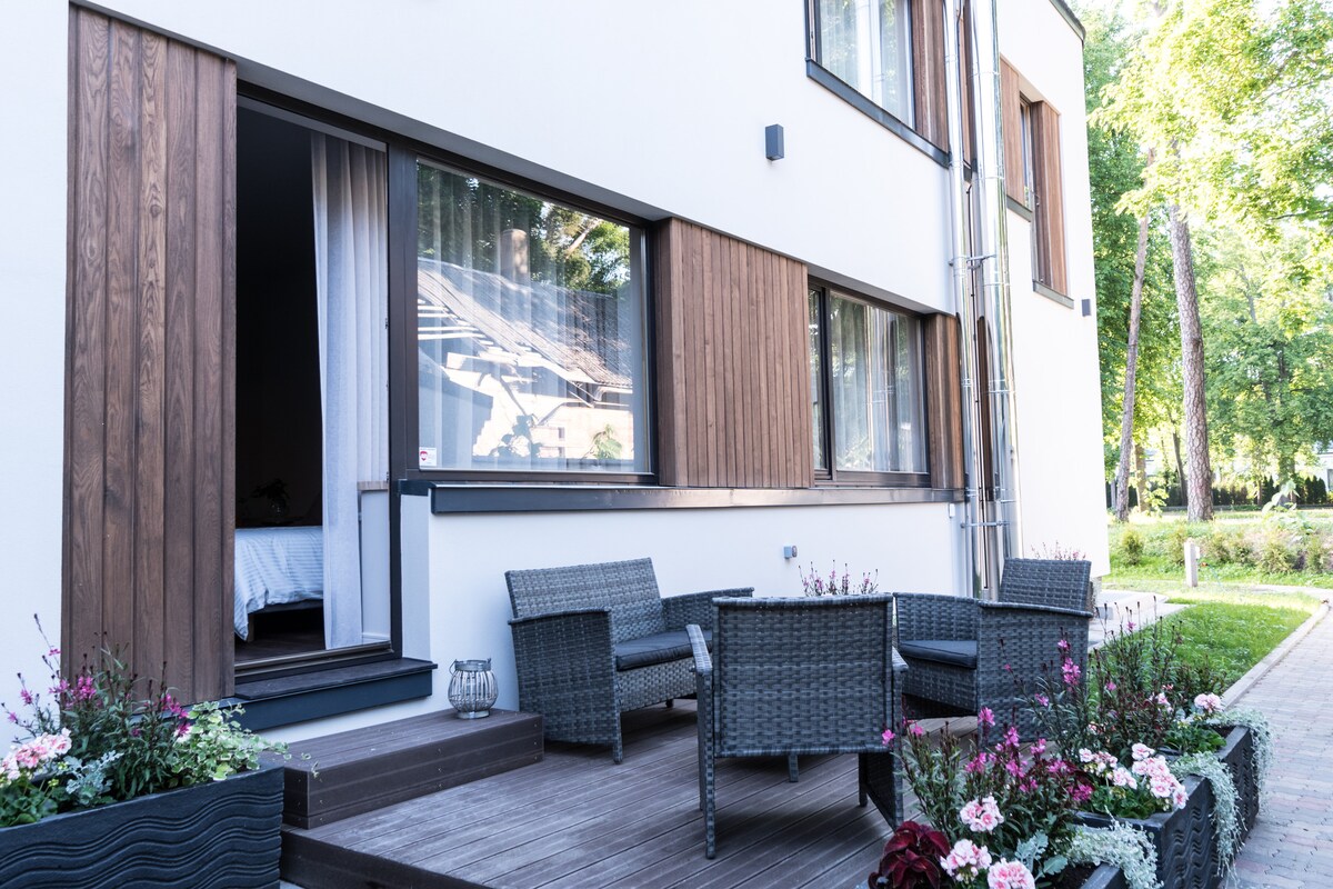 Elegante estudio con jardín privado y terraza a solo 100 m del mar. Perfecto para parejas o familias (capacidad para 4 personas). Disfrute de una estadía tranquila con una cocina totalmente equipada, wifi rápido, televisor inteligente y estacionamiento privado. Cerca de la playa de Dzintari, restaurantes y el parque forestal. Ideal para quienes aman la playa y buscan comodidad y privacidad en el corazón de Jurmala.