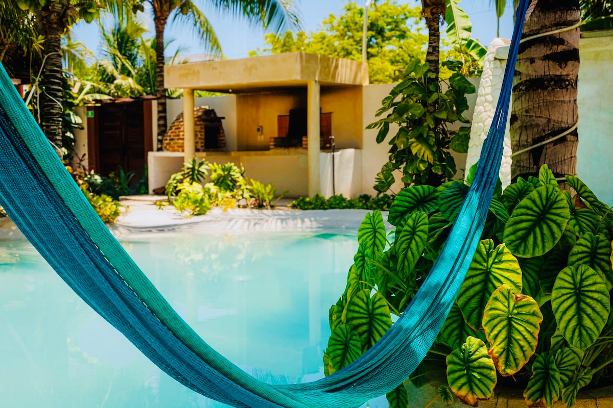 Renta de Casa completa I Nueva ¡ A SOLO 5 MIN DE LA PLAYA EN AUTO Y 15 MIN CAMINANDO! Pensada para pasar tus mejor vacaciones. Seguro, limpio, sanitizado y libre de ruidos: cuenta con espacios amplios, techos altos, mucha ventilación y luz natural. Cada área cuenta con ventilador y aire acondicionado. También tenemos un jardín amplio y jacuzzi para 12 personas. Podrás obtener toda la privacidad que deseas y sentirte como si estuvieras en casa rodeado de naturaleza y mucha tranquilidad.