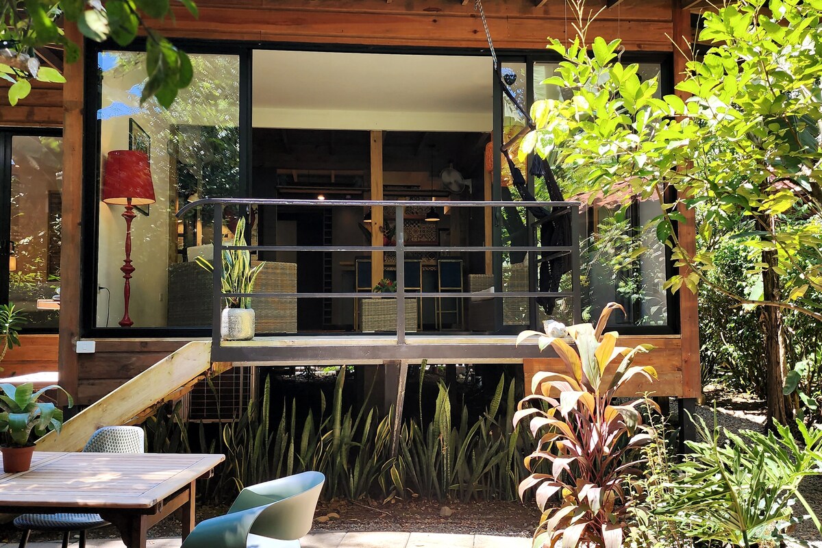 Experimenta lo mejor de la vida interior y exterior en nuestra moderna casa de 2 dormitorios y 2 baños con ventanas de vidrio deslizantes del suelo al techo, una piscina privada con mini cascada y un arroyo lleno de naturaleza que abunda en vida silvestre y tranquilidad. Este espacio limpio y familiar ofrece privacidad y seguridad. Está convenientemente ubicado al final de una carretera. Su céntrica ubicación se encuentra a pocos minutos a pie del centro de la ciudad de Uvita y las hermosas playas están a solo 5 minutos en coche.