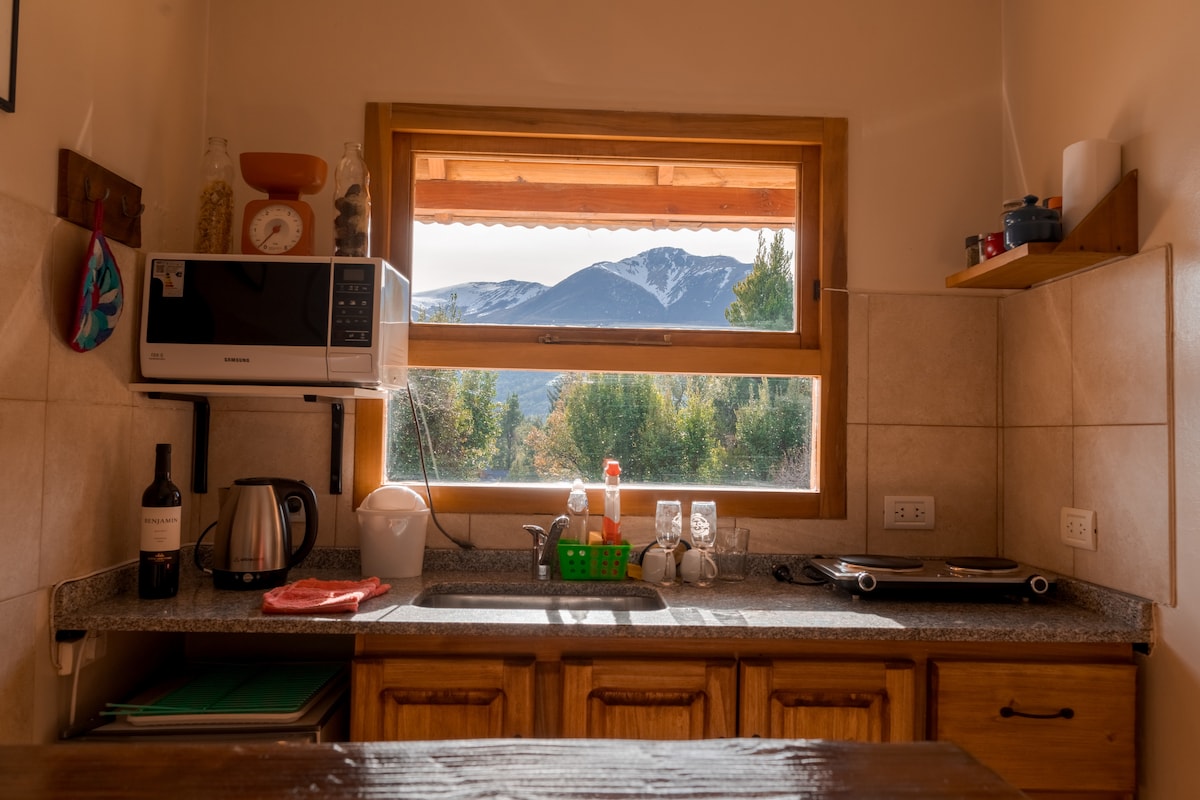 Andes cuenta con un ambiente amplio con cama matrimonial, sillón-cama, ropero y mesa. Dispone de una kitchenette muy bien equipada y un baño privado moderno y funcional. Posee acceso independiente. Incluye desayuno casero. Los huéspedes podrán disfrutar del parque con bellas vistas a los cerros, fogón y lugar para comer afuera. Desde la ventana se pueden apreciar los cerros enmarcados en la vegetación autóctona. El canto de los pájaros acompaña brindando una sensación de paz y armonía.