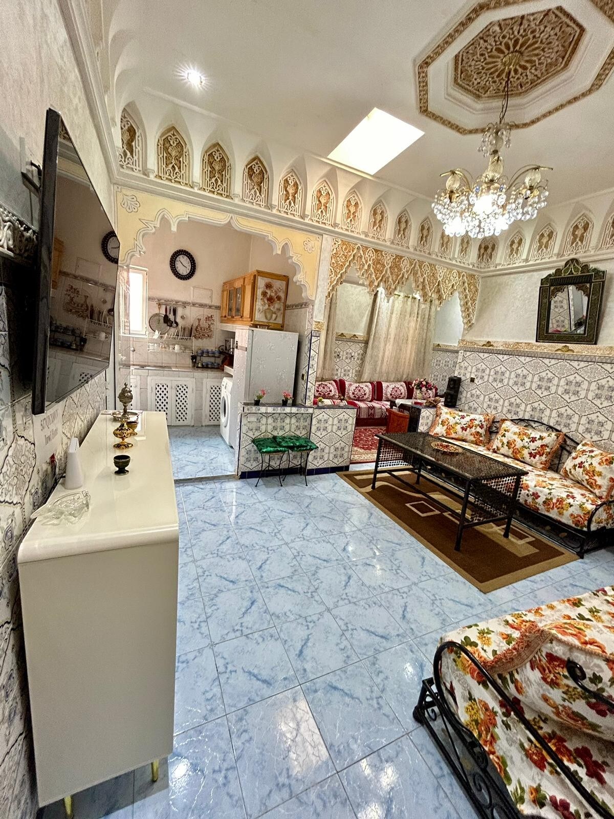 ✨ Stay in our authentic 3-level Riad (80 m²) in the heart of Marrakech. Enjoy a charming patio with fountain, kitchen, dining area, small lounge, guest bathroom, and a bedroom with en-suite on the ground floor. ✨ Upstairs, relax in a second bedroom with private bathroom, plus a reading & TV corner. ✨ End your day on the rooftop terrace, arranged as a summer lounge perfect for sunbathing or magical evenings under the stars. ✨ Comfort, tradition, and Moroccan hospitality await you