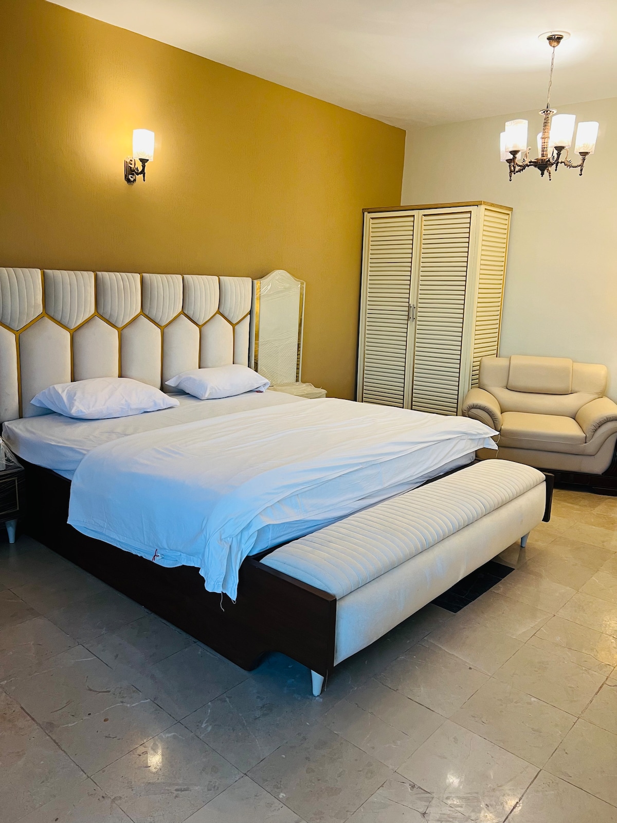 Moderno departamento de 2 dormitorios en DHA Phase 2 Extension, Karachi. Espacio luminoso y completamente amueblado con 2 aires acondicionados, wifi, 2 televisores inteligentes y una cocina bien equipada. Ubicado cerca de Khayaban-e-Ittehad, con fácil acceso a cafés, centros comerciales y Sea View. Zona segura y familiar, haz el check-in en nuestra suite de departamento.