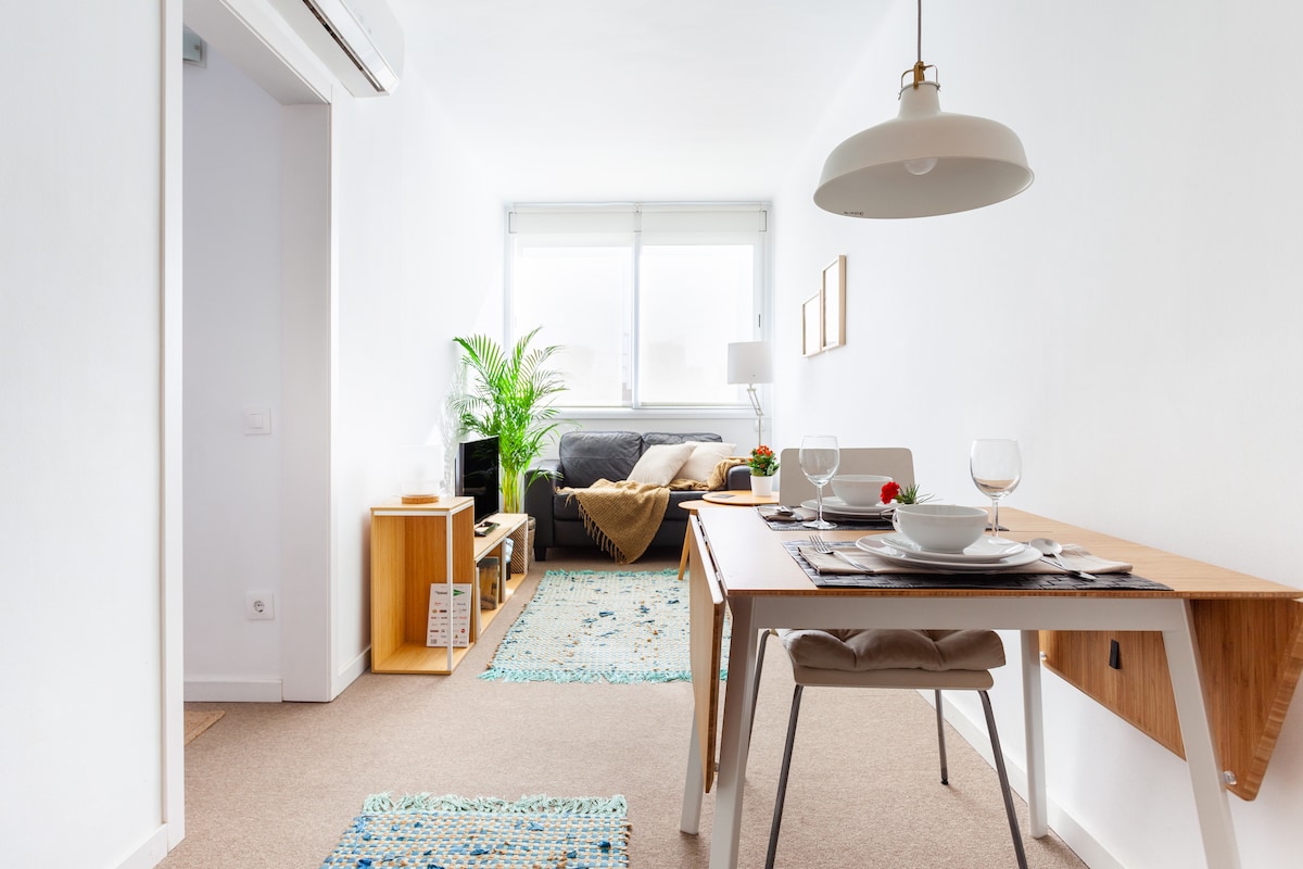 Propiedad de estilo nórdico totalmente equipada y recientemente renovada con: una habitación doble, comedor, living con un cómodo sofá cama, baño completo y cocina totalmente equipada. Amplia ventana del piso al techo con luz natural todo el día TVSMART40 ’, cafetera NESPRESSO, hervidor de agua, cápsulas y té de cortesía, fibra óptica de INTERNET DE ALTA VELOCIDAD, aire acondicionado, lavadora y secadora, lavavajillas. CAMA TAMAÑO KING de 1,8x2 M, colchón de alta calidad, SOFÁ CAMA para la tercera a cuarta persona. Colchón adicional disponible en el piso para la cuarta persona