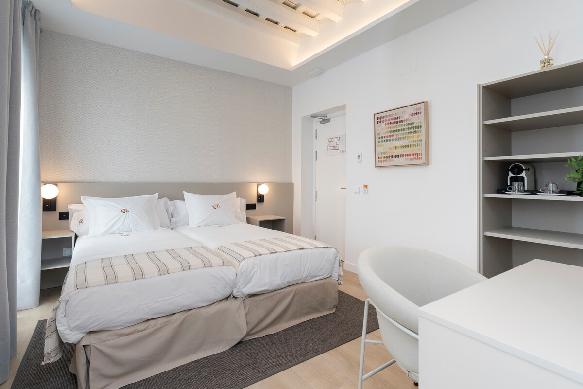 Habitación de 19-21m2 confortable y funcional. Equipada con todo tipo de accesorios como nevera, caja fuerte, albornoces, zapatillas y secador. Destaca su iluminación natural, su mobiliario y diseño actual y elegante, así como sus materiales y acabados. Cama de matrimonio de 180x200cms, ropa de cama de algodón egipcio 100% ecológico y balcón cubierto e insonorizado hacia la calle. Preparada para disfrutar del mejor descanso. Entra y descubre que la magia está en los detalles.