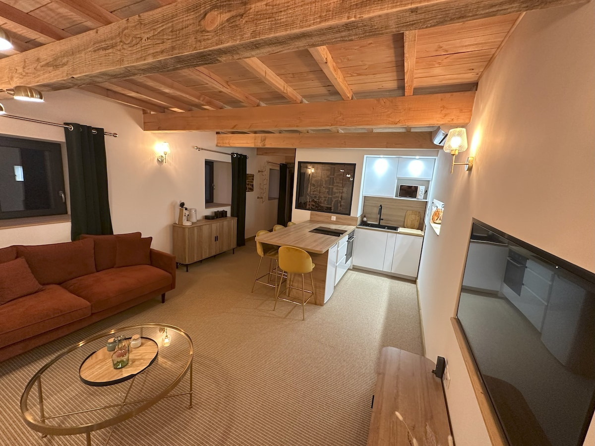 Alojamiento turístico amueblado de 4*: 65 m2 en un entorno verde. La terraza privada da a un bosque de robles y pinos con vistas a las colinas. Un dormitorio con una cama grande (calidad hotelería) y un baño en suite + una cocina abierta totalmente equipada y con vistas a una sala de estar con 2 bancos-cama individuales. Equipamiento completo, piscina compartida con los propietarios Estaremos encantados de hablar de buenas direcciones de la zona si los viajeros lo desean.