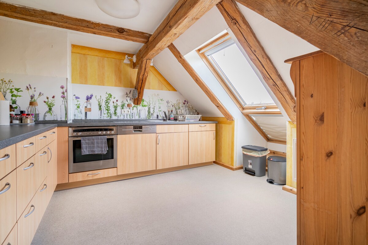 En un antiguo establo de caballos de 1900, reformado con mucho cariño, os espera un acogedor apartamento de vacaciones en medio del campo. Podéis utilizar el gran jardín. El apartamento se distribuye en dos plantas. En la planta baja hay un dormitorio grande con cama doble y cuna. En la planta superior se encuentra la amplia sala de estar y comedor, otro dormitorio con dos camas individuales, la cocina y el baño. En el acogedor ático hay dos colchones más.