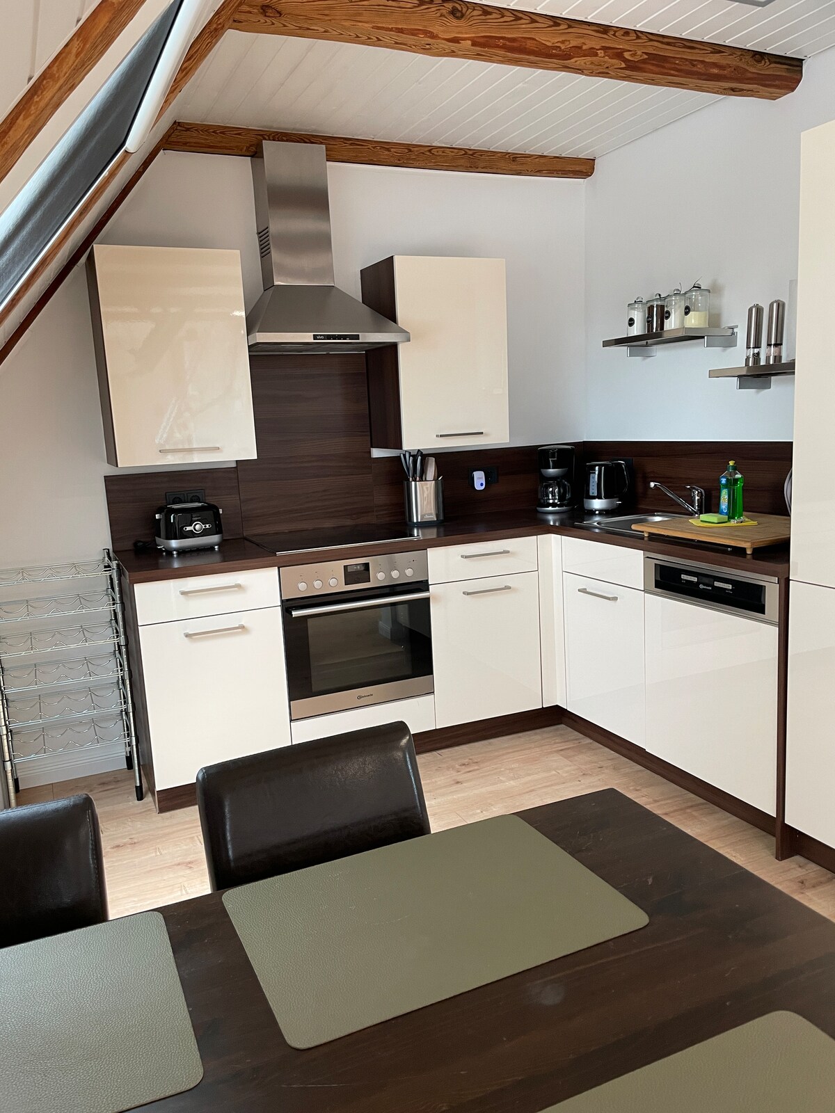 Willkommen in unserer stilvollen Ferienwohnung – ideal für Familien, Gruppen und Freunde. Die 2022 fertiggestellte Unterkunft bietet auf ca. 170 m² modernen Wohnkomfort. Euch erwarten ein großzügiger, offener Wohn- und Essbereich mit voll ausgestatteter Küche, vier separate Schlafzimmer, zwei Bäder sowie ein Schlafsofa für zwei weitere Gäste. Platz für bis zu 10 Personen. Highlight ist der helle Wohnbereich mit hoher Decke, offenem Fachwerk und verglastem Tennentor mit Blick auf den Dorfplatz.