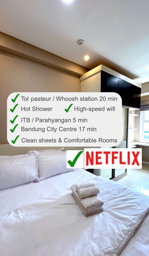Location in the central area of Bandung .The location is near big malls in bandung ( Bandung Indah Plaza Mall and Bandung Electronic Center) and iconic braga street. There is a swimming pool and gym. Parking fee: 3000idr/hour Max parking fee: 15000idr,-for 24 hour parking area at b1-b3 acces entry vehicle from Jl. Merdeka WIFI up to 60 Mbps. Netflix,Viu, vidio premier league, and YouTube premium ✅️ We are very concerned about the cleanliness and comfort of our place 🙏