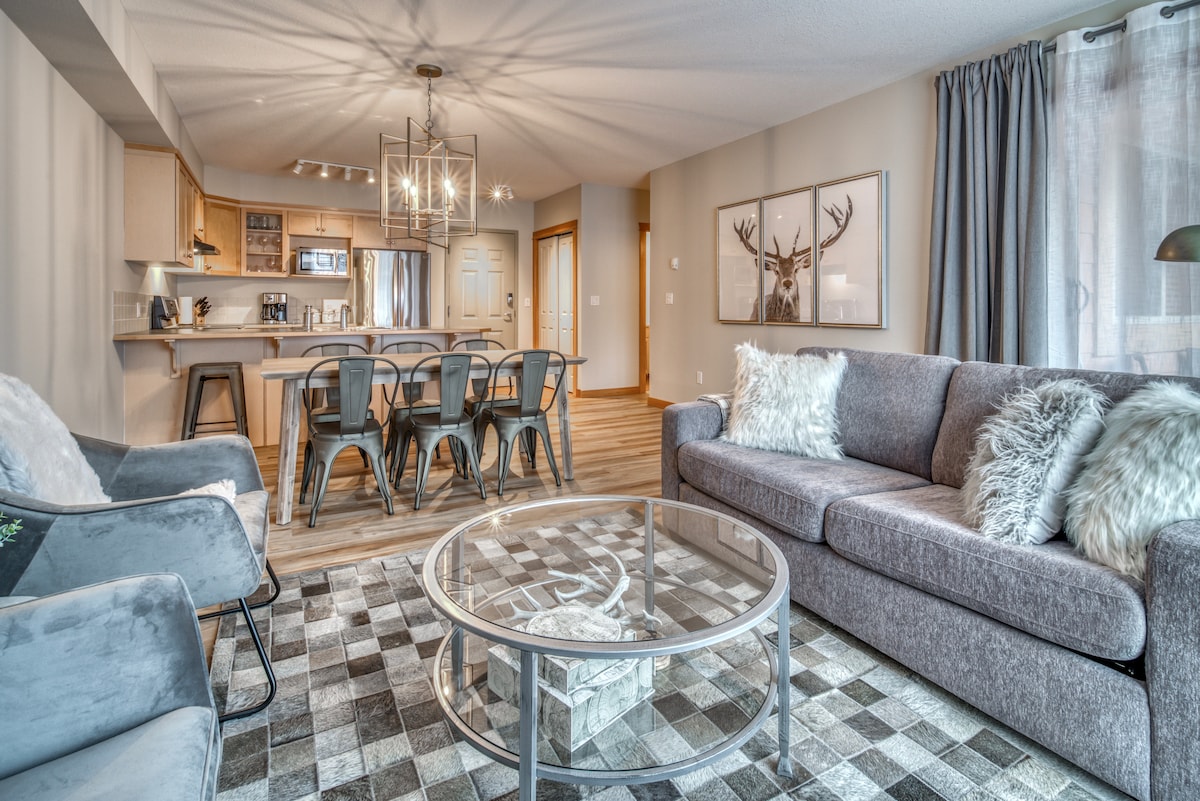 Este lujoso apartamento de dos dormitorios de 1700 pies cuadrados cuenta con todo lo que necesitas en un hogar lejos de casa. ¡Disfruta de una hermosa cocina abierta, una enorme chimenea y techos abovedados que ofrecen impresionantes vistas panorámicas a las montañas! Fuera de tu apartamento hay senderos para caminar, cafeterías, tiendas de comestibles, restaurantes y mucho más. Este lugar de vacaciones es ideal para parejas, familias y grupos que buscan el mejor alojamiento para explorar las Rocosas canadienses.