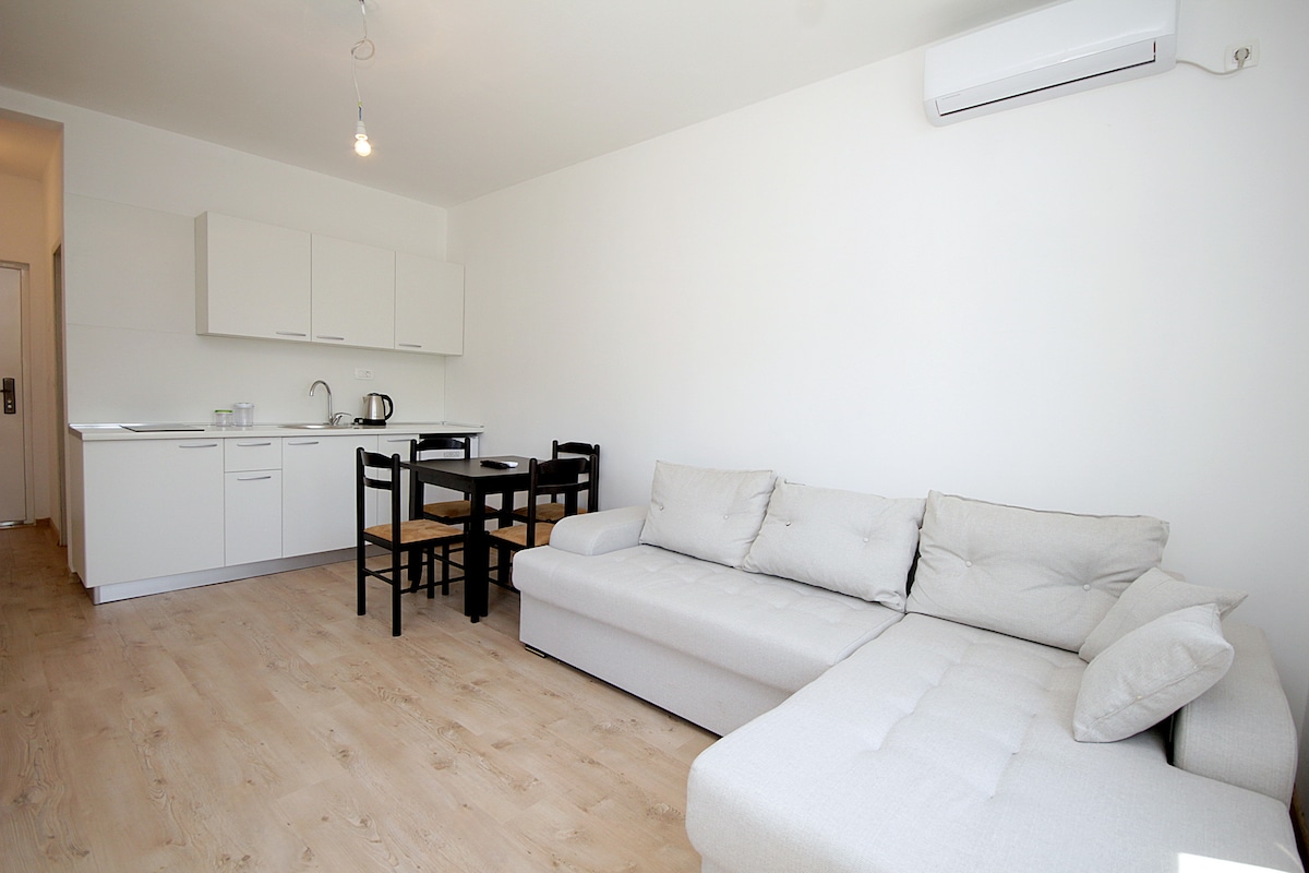 The apartment is located right next to the sea port and the beach. City center, two groceries, a lot of bars and cafes within walking distance. There is one bedroom with balcony and studio area with kitchen, TV, two sofa-beds, dining table and with balcony as well. Both rooms with air condition. In the kitchen you can find any kitchen equipment you would need. You can find all the necessary bedding in the wardrobe and pantry. Small bathroom with a washing machine, washbasin and shower.