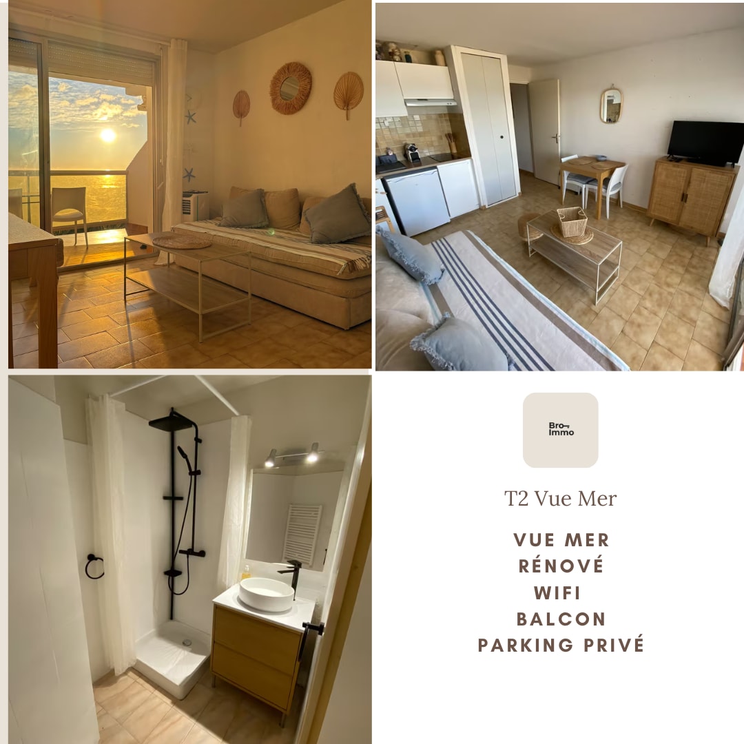 Profitez d’un appartement baigné de lumière avec sa terrasse face à la mer et la plage, sans vis à vis. Appartement 2 pièces d'environ 30 m2, terrasse 10 m2 et place de parking privative. Prestations de confort dans un style moderne et épuré. Il est situé au 2è étage (sans ascenseur) d’une résidence très calme. Le linge est fourni (lit + toilette). Literie récente (2024) 140x190. 2 TV. WIFI (fibre). Idéal pour 2 personnes