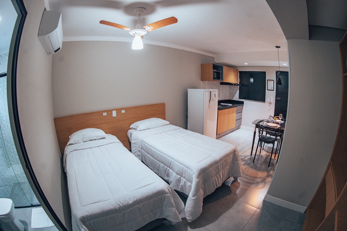 Una experiencia de alojamiento elegante y cómoda en Home Studio. Bien ubicado para trabajar, estudiar o para relajarte y relajarte. Está cerca del centro de la ciudad, el Hospital Amaral Carvalho, Jaú Shopping, Jaú Serve Supermercado, Drogaria São Paulo, Mc Donald's, Jahu River Park y restaurantes. El estudio es nuevo, con muebles y electrodomésticos, aire acondicionado, TV, wifi, estacionamiento cubierto y tiene varias comodidades como gimnasio, espacio de coworking, lavandería y barbacoa.