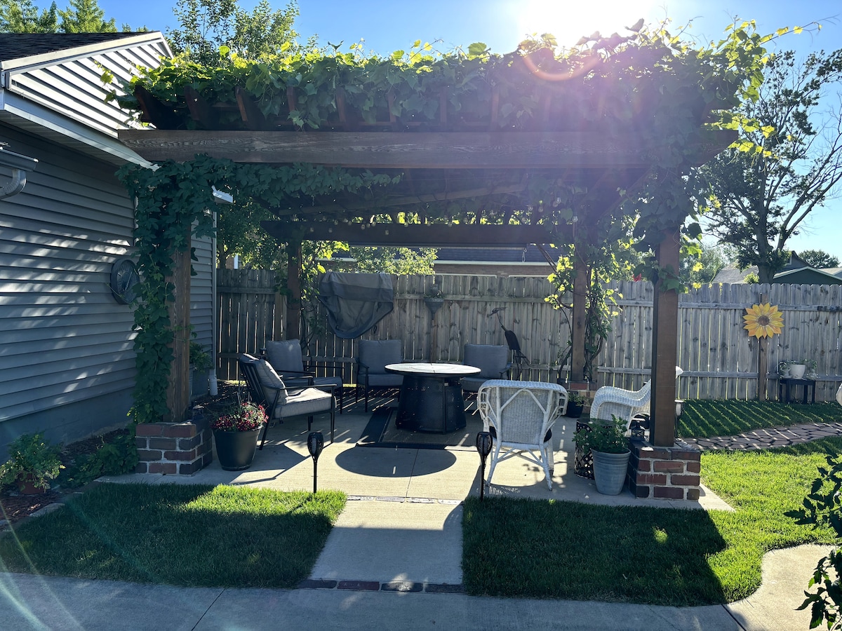 Te damos la bienvenida a "Lake 2 Grapes" Bridgman es una pequeña joya ubicada entre St. Joe y Warren Dunes. A minutos de las playas del lago Mi, cervecerías artesanales y senderos para vinos. Relájate en el nivel superior de nuestra casa de vacaciones de dos niveles con entrada privada. ¡Este baño de 3 dormitorios y 2 baños incluye una hermosa suite principal! Disfruta del jacuzzi y el fogón en la parte trasera. ¿Ruta de vinos? Quédate con nosotros y recibirás un descuento con "Tours de uvas y uñas", además de servicio de recogida y traslado de cortesía. Debe tener 25 años o más para reservar.