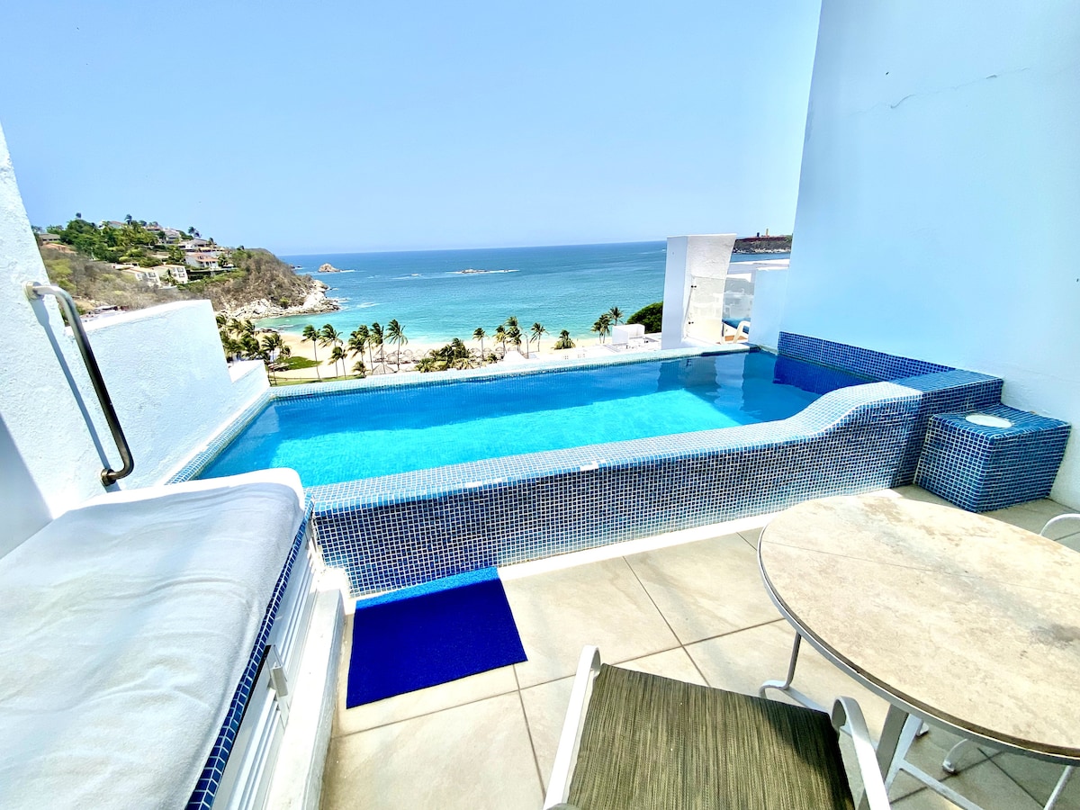 Punta Paita Villa! 3 bedrooms overlooking impressive views of the Tangolunda bay and islands. Wildly impressive detail in architecture and landscaping throughout the property. All rooms have AC, Wifi, and private baths. Comfortable dining lounging by the pool and cozy interiors to relax and entertain in. Sleeps 7. Daily maid Service, and public access to a beautiful bay less then a 10min Hike down the road. Ask about our sister property for more space!