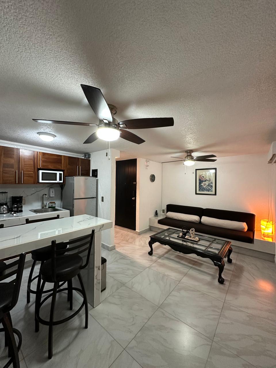 Departamento a 10 min de zona hotelera y playas remodelado Pb, ingreso por chapa electrónica, 2 habitaciones cada una con aire acondicionado, ventiladores,pantallas, baño con agua caliente y dispensador de shampoo, secadora de pelo, caja fuerte, sala, comedor con aire acondicionado, pantalla, cocina equipada, cuarto de servicio con lavadora y secadora, estacionamiento y vigilancia 24 horas.
