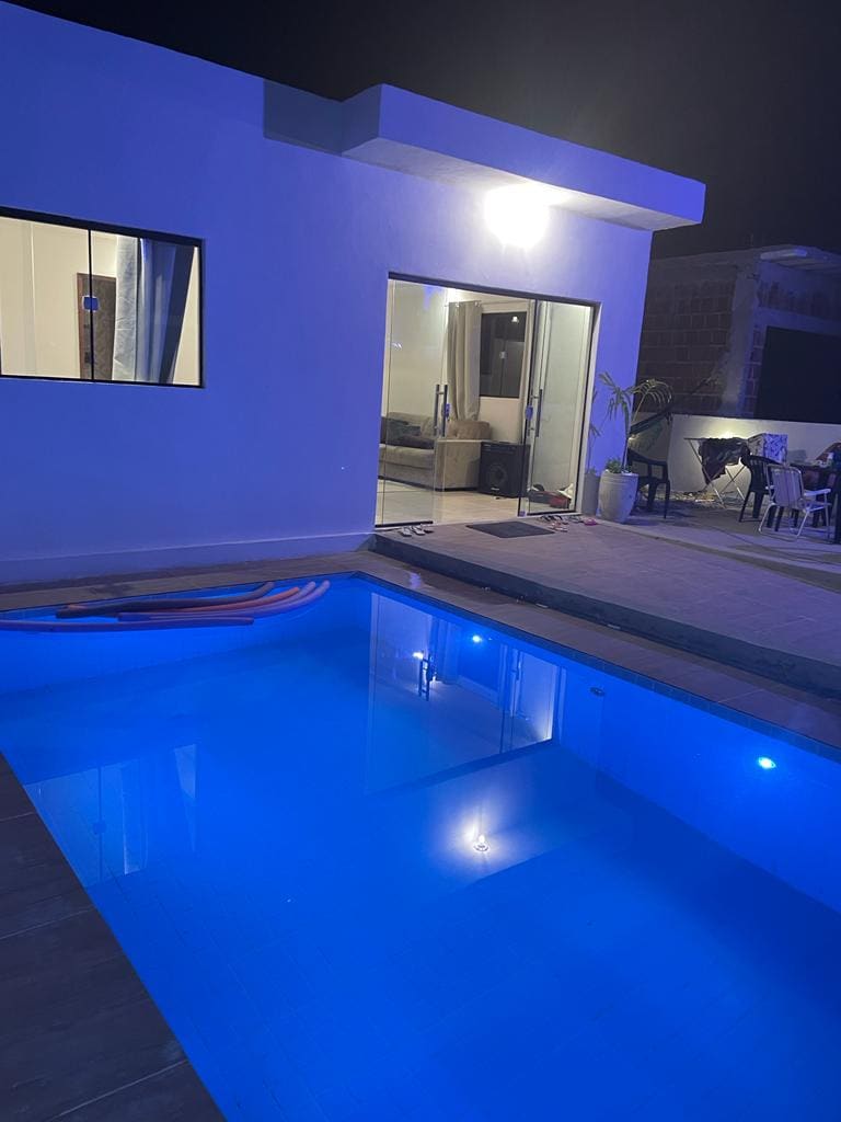 Se procura conforto e limpeza, acaba de encontrar, todos quartos climatizado, 3 quartos suíte, 1 sem ser suíte,1 banheiro social, outro banheiro na área da piscina, sala climatizada, A casa é nova, estamos deixando ela cada vez mais aconchegante para vocês. OBS: não aceitamos animais domésticos. reserva mínima duas diárias, feriados consultar preço. "piscina grande de 6 metros".