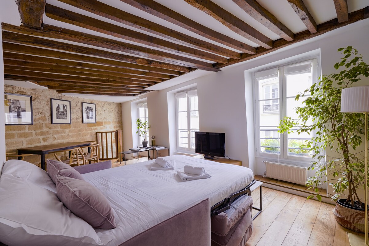 Este estudio decorado con buen gusto con el espíritu de una suite de hotel, le hará vivir una experiencia excepcional en el corazón del París de los artistas. Situado en el séptimo y último piso de un edificio de piedra de talla (ascensor hasta el sexto), sus 35 m2 ofrecen un nivel de confort digno de un hotel de 4*: cama Queen Size, ducha XXL, equipo de música, tranquilo... El pequeño plus para que su estancia sea inolvidable: ¡la vista panorámica de los tejados y la Torre Eiffel desde las dos grandes claraboyas de la sala de estar!