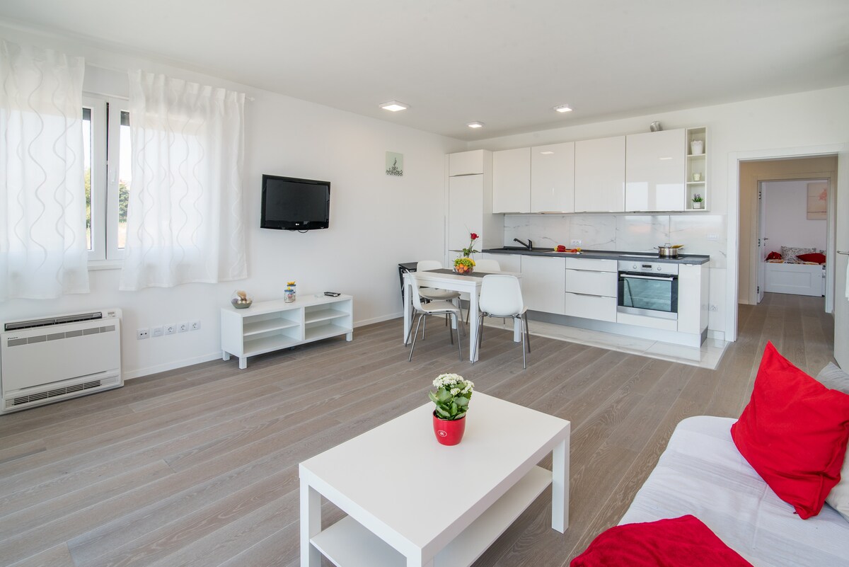 El Apartamento Mila es un apartamento completamente nuevo, situado en un barrio residencial exclusivo de la ciudad de Krk. El apartamento es moderno, luminoso y espacioso, con líneas limpias, muebles modernos y nuevas vistas abiertas al mar y al casco antiguo. Consta de un salón con cocina y comedor, dos habitaciones dobles y un baño. Todas las habitaciones tienen calefacción y aire acondicionado incluidos en el precio. El apartamento también tiene dos plazas de aparcamiento cubiertas.