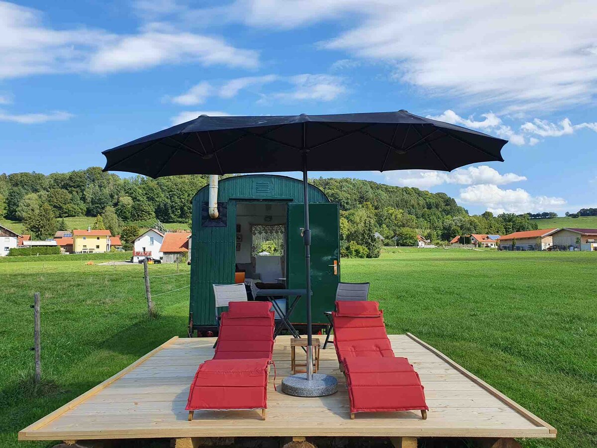 El acogedor alojamiento en caravana es bastante pequeño para un breve descanso, cocina incluida. cafetera, miniterraza; aseo y pequeño lavabo justo enfrente fuera del alojamiento, NO HAY DUCHA directamente en la caravana. Ducha a 1 minuto a pie. ¡En la propia caravana no hay conexión de agua activa! ¡Tenga en cuenta las opciones alternativas para dormir cuando las temperaturas bajen de cero! A 8 km de Kempten, varias actividades en el lugar, coaching, equitación, fútbol sala, panadería y Edeka directamente en el lugar
