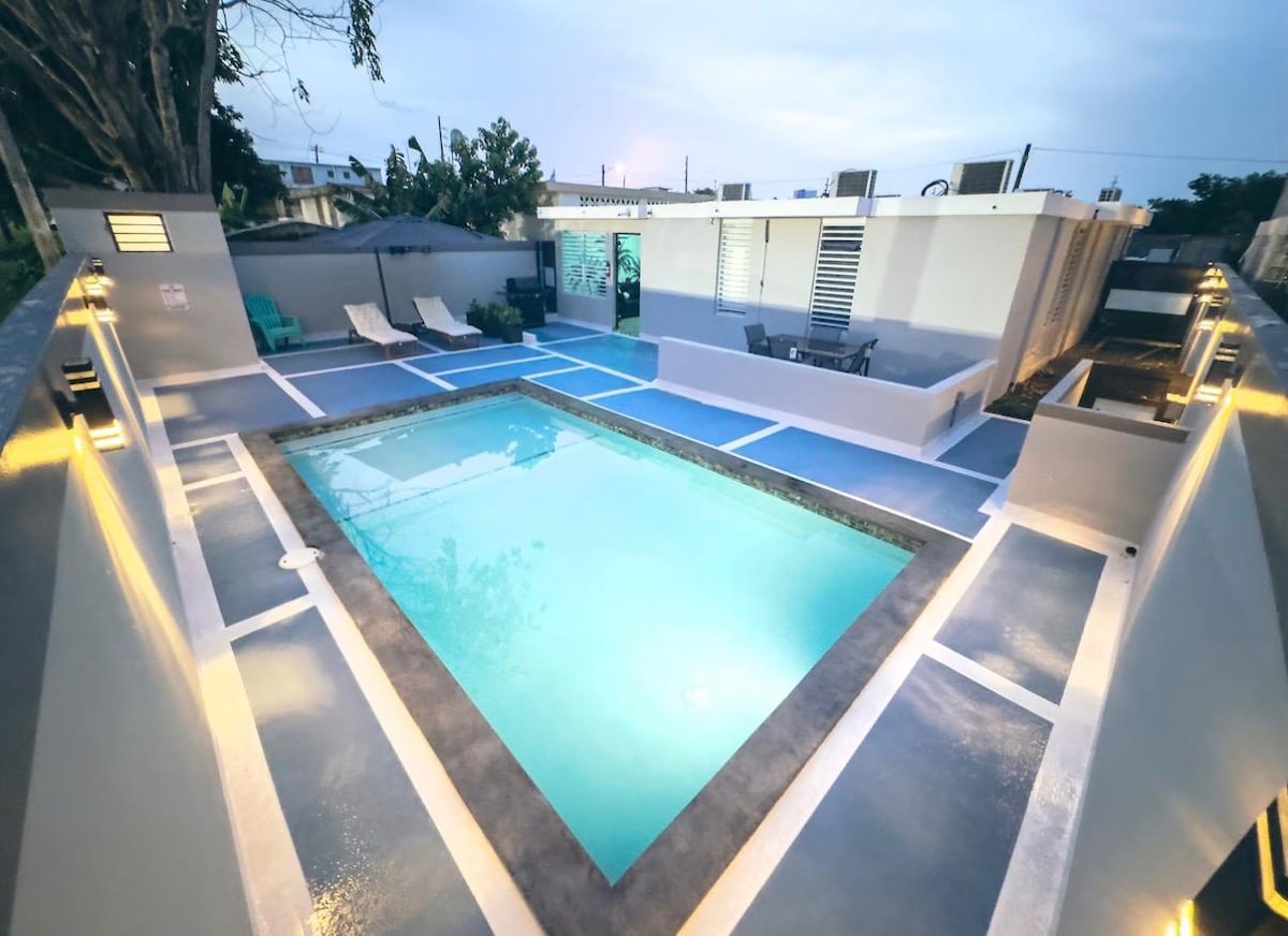 Disfrutaras de una casa entera con sala con Smart TV, comedor, cocina equipada, 2 cuartos con A/C, un relajante salon de juego con A/C, mesa de hockey, barra con copas y TV; area de terraza con muebles, mesa de domino, Piscina y BBQ; ademas, de otra sala de estar con TV. Perfecta Localizacion: a min. de playa Punta Salina, tren Urbano, el Parque de las Ciencias y el Viejo San Juan. Es tu estadía ideal para explorar Puerto Rico. Parking bajo techo cerrado con puerta de garage para 2 autos.