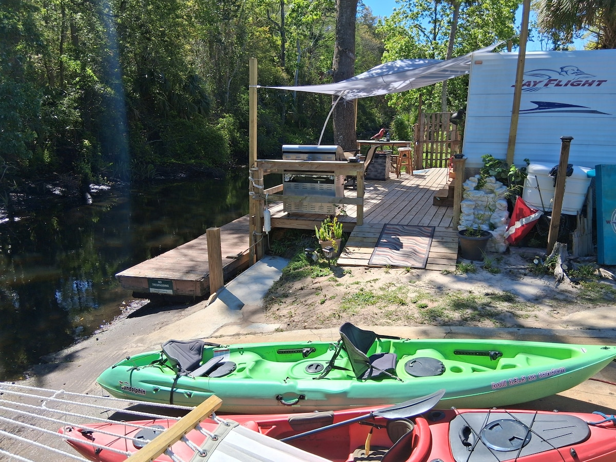 Find your zen...Relax in the surroundings of an 150 acre bird sanctuary. Hear the sounds of the birds and star gaze into the night. Paddle to the crystal clear waters of the weeki wachee from remote bay lake pond, then 15-20 min nature paddle down canal to river . Observe manatees, birds, otters and turtles , or spend the afternoon at the beach watching dolphins or cast a fishing line into the pond or river..