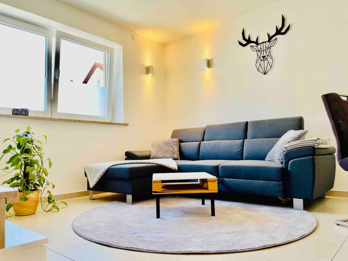 Hola y bienvenidos al apartamento de 1 habitación con una vista al campo en el primer piso de un apartamento en un lugar tranquilo en un bosque tranquilo. El apartamento recién reformado tiene una gran cama doble, comedor/zona de trabajo, sillón con taburete y una nueva cocina adjunta. Amplio baño con dos lavabos, BD y bañera con tabique de ducha en diseño de los años 70. Un televisor inteligente de 40 pulgadas. Internet de hasta 400 m ² y comodidades sensatas están presentes.