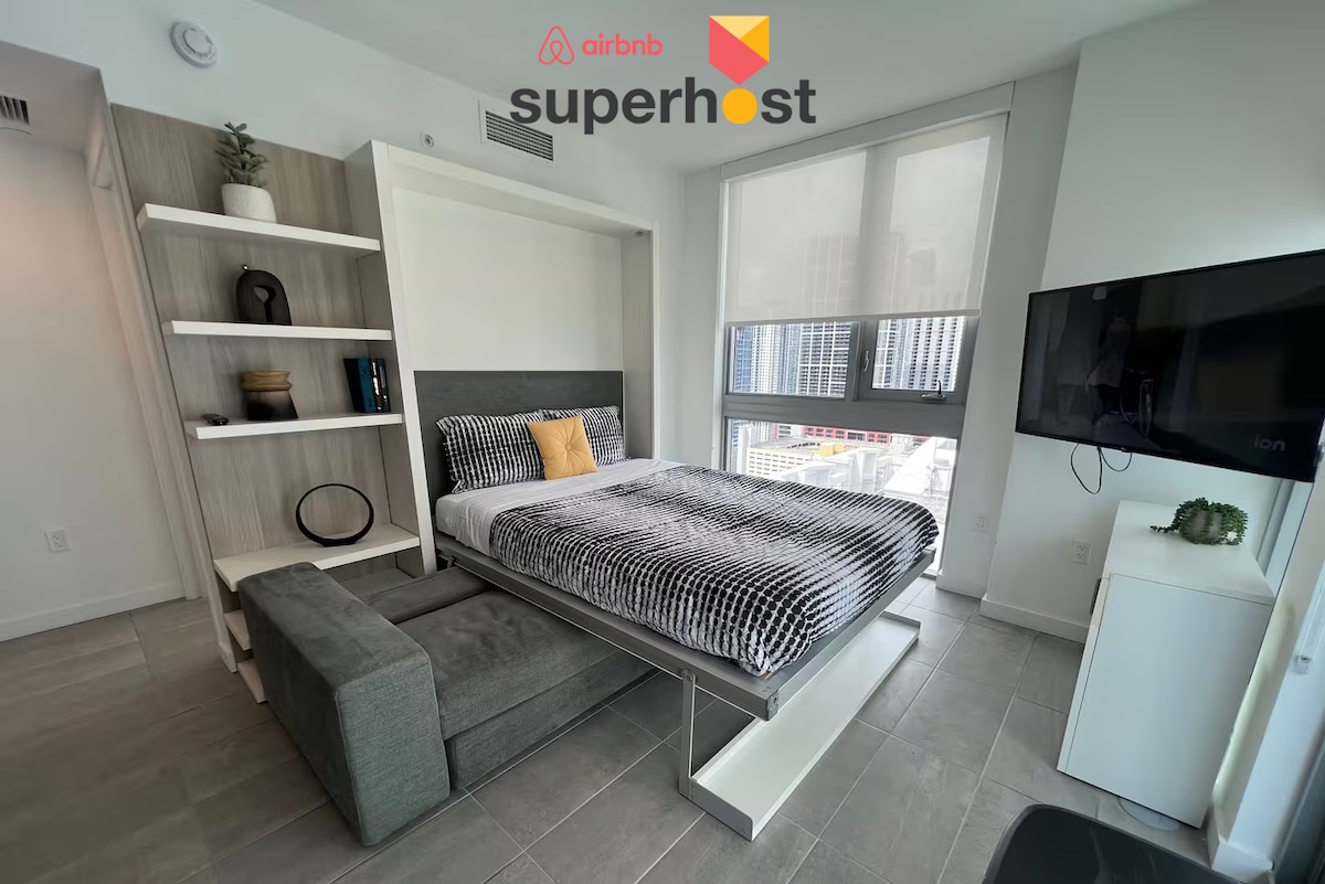 Estudio moderno en el centro de Miami, perfecto para un máximo de 4 huéspedes. Cuenta con 2 camas tamaño queen, un baño elegante y una cocina totalmente equipada. Disfruta de impresionantes vistas de la ciudad desde el balcón privado y aprovecha la lavadora/secadora, el wifi y la televisión de la unidad. El edificio ofrece acceso a una piscina elevada y climatizada, jacuzzi, gimnasio totalmente equipado y un espacio de trabajo para viajeros de negocios. Ideal tanto para la relajación como para la productividad, este lujoso espacio es tu refugio perfecto en Miami. ¡Reserva ahora!