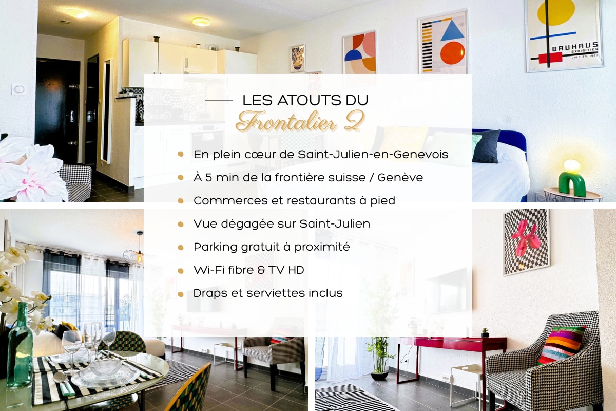 Perfectamente ubicado a 5 minutos de la aduana suiza, nuestro moderno estudio de 25 m2 fue completamente renovado en 2024, amueblado y equipado cuidadosamente con gusto. Ideal para un período de prueba en Ginebra, viaje de negocios, también es cómodo para visitas turísticas y esquí. El alquiler estratégico: -5 minutos de la frontera en auto, 15-20 minutos de Ginebra y 30 minutos de Annecy, - autobús hasta el centro de Ginebra (30 min), autopista, un parque acuático, esquí, estación de tren, centro de la ciudad... -Supermercado enfrente