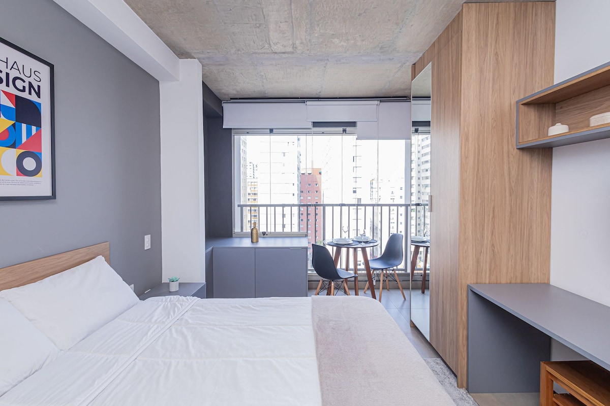 El Flat Nobile está completo y ubicado en el corazón de Jardins - en Al. Campinas, en la esquina de Al. Santos, a solo 1 cuadra de Paulista Ave. Tiene 30m2. Bien decorado w/ sala de estar y dormitorio, tiene 1 cama queen (se puede convertir en 2 camas individuales) y puede alojar hasta 4 personas. Tiene un sofá cama / Wi-Fi / TV, aire acondicionado, cocina equipada, mesa de escritorio, restaurantes en el primer piso y servicio de habitaciones las 24 horas. Cuenta con piscina, gimnasio, lavandería, estacionamiento y servicio de limpieza diario.